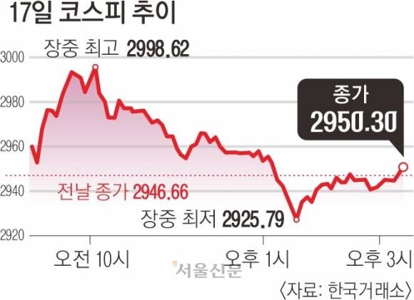 17일 코스피는 전 거래일 대비 0.12% 상승한 2950.30으로 거래를 마쳤다. 코스피가 종가 기준 2950을 넘은 것은 2022년 1월 13일(2962.09) 이후 처음이다.