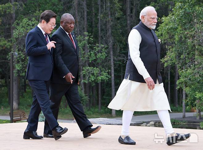[카나나스키스(캐나다)=뉴시스] 최진석 기자 = 이재명 대통령이 17일(현지 시간) 캐나다 앨버타주 카나나스키스 주요 7개국(G7) 정상회의장에서 열린 51차 G7 및 초청국 정상 단체사진 촬영에 입장하며 시릴 라마포사 남아공 대통령과 대화를 나누고 있다. 2025.06.18. myjs@newsis.com