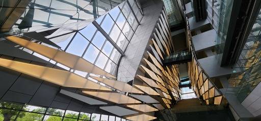 세 건물은 서울식물원을 바라보는 실내 아트리움에서 연결되는데, 이곳에는 입주 계열사와 부서 간 교류를 위한 공용 공간들이 자리하고 있다. 실내 아트리움에 들어서면, 바깥에서 시선을 사로잡았던 독특한 입면보다 더 놀라운 장면을 마주하게 되는데, 바로 2~6층 사이에 배치된 ‘그랜드 스테어(Grand Stair)’다. 계단 형태의 광장으로 건축가 톰 메인은 영화 ‘로마의 휴일’에 나오는 로마의 스페인 계단에서 영감을 얻어 이 공간을 설계했다고 한다.