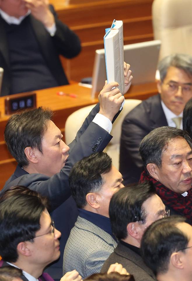 | ▲ 2024년 12월 27일, 국민의힘 박수민 의원이 국회 본회의에서 한덕수 국무총리 탄핵소추안 투표가 진행되는 동안 '헌법재판소법'을 들고 우원식 의장에게 항의하고 있다. |