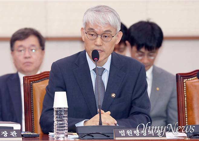 | ▲ 천대엽 법원행정처장이 지난 5월 2일 서울 여의도 국회에서 열린 법제사법위원회 전체회의에서 의원 질의에 답하고 있다. |
