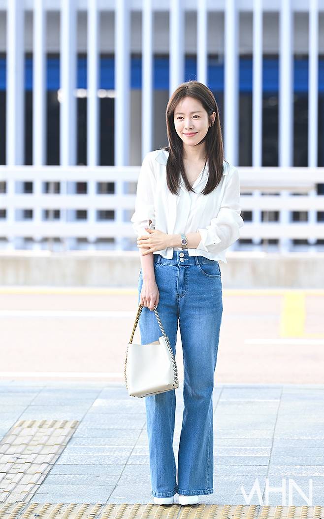이날 한지민은 밑단이 살짝 퍼지는 부츠컷 데님과 화이트 블라우스와 화이트 숏 재킷을 매치한 세련된 여름 룩을 선보였다.