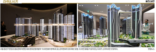 지난 13일 용산구 한강로 3가 5층에 마련된 HDC현산 홍보관의 웅장한 문이 열리자 압도적인 모형이 눈길을 사로 잡았다. HDC현산이 전면1구역 조합에 제안한 '더 라인 330'이었다. 더 라인 330은 단지 내 초고층 타워를 잇는 330m 길이의 스카이라인 브릿지에서 이름을 따왔다. HDC현산은 지상 74.5m 높이에 떠 있는 이곳을 360도로 한강 조망이 가능한 '하이라인 커뮤니티'로 구축할 예정이다.