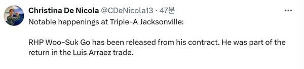 MLB.com 마이애미 담당 기자 크리스티나 드 니콜라는 18일(이하 한국시간) "마이애미 말린스가 고우석을 방출했다"고 전했다.