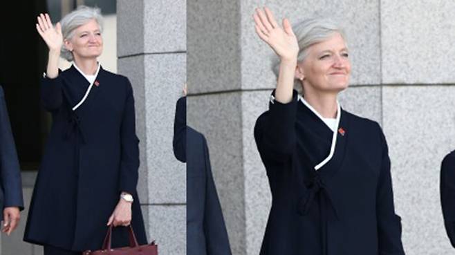 주인공은 타마라 모휘니 주한 캐나다 대사인데 서양식 정장을 입은 이들 사이에서 홀로 감색 두루마기 한복을 입어 눈길을 사로잡았습니다.