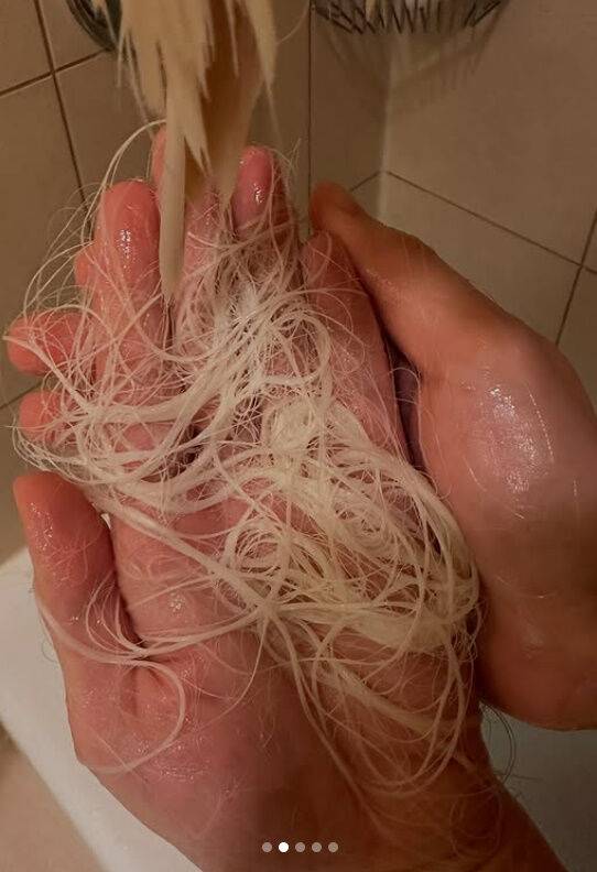 사진은 한웅큼씩 빠지는 머리카락과 거의 삭발이 된 머리를 담고 있어 충격을 주고 있다.