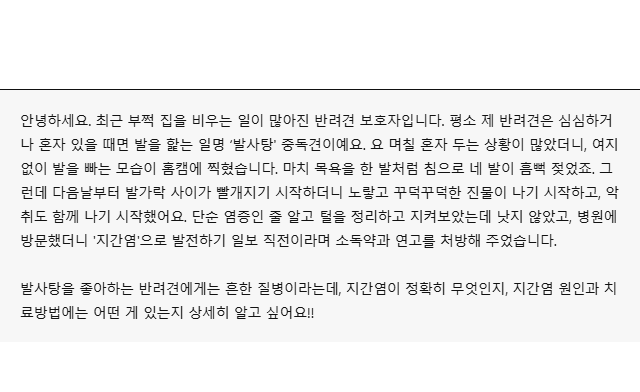 안녕하세요. 경기도 최초 피어프리 전문가 인증 블루베어동물병원 대표원장이자 반려인인 신성우 수의사입니다. 반려견이 조용하다 싶으면 숨어서 발을 빨고 있는 경우가 많죠? 말리면서도 귀여움에 웃음을 숨길 수 없는데요. 오늘 사연자분의 반려견처럼 발을 빠는 습관이 있는 강아지에게 지간염은 꽤 흔하게 발생합니다. 가볍게 생각하고 관리하지 않았으면 고질적인 피부질환으로 이어질 수 있는 질환인데요. 오늘 지간염에 대한 것들을 같이 알아보도록 할게요!