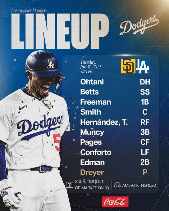 다저스는 18일(이하 한국시간) 미국 캘리포니아주 로스앤젤레스 다저 스타디움에서 열리는 2025 메이저리그(MLB) 정규시즌 샌디에이고 파드리스와 홈경기를 앞두고 선발 출전 명단을 공개했다.
