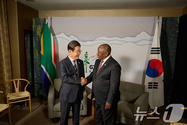 (서울=뉴스1) 허경 기자 = 주요 7개국(G7) 정상회의 참석차 캐나다를 방문한 이재명 대통령이 16일(현지시간) 캘거리 한 호텔에서 열린 시릴 라마포사 남아공 대통령과 한-남아공 정상회담에서 악수하고 있다. (대통령실 제공. 재판매 및 DB 금지) 2025.6.18/뉴스1