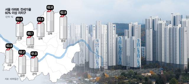 이같이 갭투자가 활기를 띠는 것은 집값 상승 조짐에 서둘러 매수하려는 수요뿐만 아니라 아파트 전세가율이 계속 높아지고 있다는 점도 요인이다. KB부동산 통계에 따르면 지난달 전국 아파트 전세가율은 68.18%로 나타났다. 이는 코로나19 사태 이후 집값 고점기였던 2021년 3월(68.5) 이후 50개월 만에 가장 높은 수준이다. 서울은 전체 아파트 평균 전세가율은 53.37% 이지만 지난해 3월 이후 1년 넘게 53% 아래로 떨어진 적이 없다. 지난해 3월 서울 25개 자치구 중 아파트 전세가율이 60%를 넘긴 곳은 성북구 1곳에 불과했지만, 1년 2개월 만인 지난달에는 8곳으로 늘었다. 중랑(62.9%)·금천(62.2%)·강북(62.6%)구가 62%를 넘겼고, 관악(61.0%)구와 성북(60.9%)·은평(60.9%)·구로(60.9%)·서대문(60.1%)구도 60%를 웃돌았다.