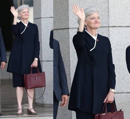 타마라 모휘니 주한 캐나다 대사는 모두가 서양식 정장을 입은 가운데 홀로 감색 두루마기 한복을 입어 시선을 끌었다.