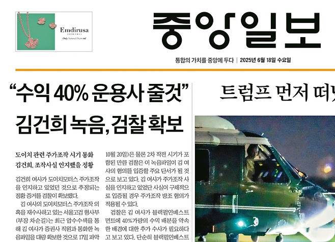 ▲ 중앙일보 = "수익 40% 운용사 줄것" 김건희 녹음, 검찰 확보