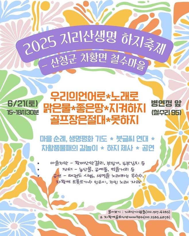 차황골프장반대주민대책위원회는 오는 21일 오후 산청군 차황면 철수리 병연정에서 "골프장 추진으로 위협받는 철수마을의 숲과 친환경 농지 보전을 기원하는 하지축제"를 연다.