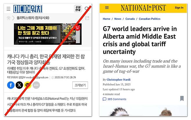 | ▲ 미디어워치(왼쪽)는 17일 캐나다 일간지 '내셔널포스트' 기사(오른쪽)를 근거로 카니 캐나다 총리가 이재명 대통령을 제외한 전 참가국 정상들과 양자 회동을 할 계획이라고 밝혔지만, 원래 해당 매체 기사는 캐나다 정부가 지난 14일 발표한 6월 15일 일정표에 따른 보도였고, 실제 6월 17일 카니 총리 일정표에는 이 대통령과 양자 회동 일정이 포함돼 있었다. |