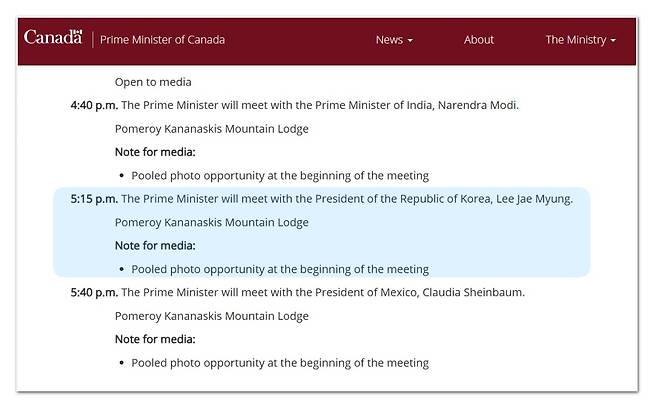 | ▲ 캐나다 정부가 16일(현지 시간) 홈페이지에 공개한 6월 17일 카니 총리 일정표에는 이재명 대통령과 양자 회담 일정이 공개돼 있다. |