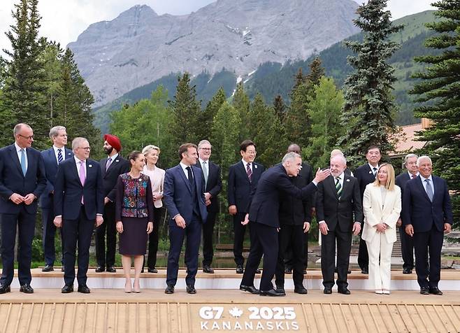 이재명 대통령이 17일(현지시간) 캐나다 앨버타주 카나나스키스 주요 7개국(G7) 정상회의장에서 기념 단체 사진을 촬영하고 있다. 2025.6.17.카나나스키스/김호영기자