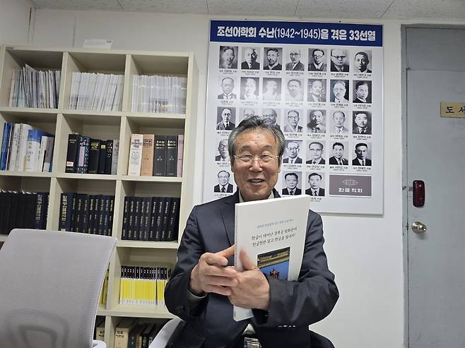 | ▲ 한글학회 사무실, 조선어학회 33인 사진 앞 저자 “세종대왕께서 우리 글자를 만드시느라 얼마나 애쓰셨고 주시경 선생과 조선어학회 선열들께서 왜 한글을 살리고 빛내려 했는지 되새기고 오늘 우리도 한글을 빛내는 일에 온 국민이 애쓰면 좋겠습니다”라고 말하고 있다. |