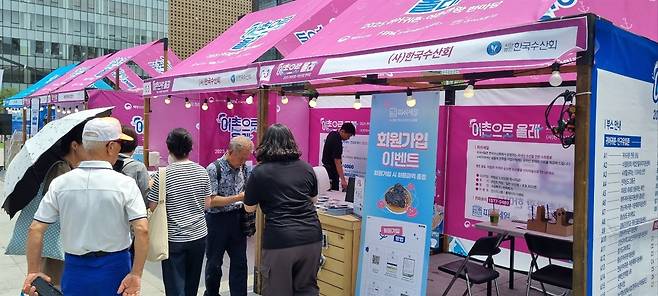 | ▲ 어촌특화상품존 바닷가 특산품으로 구성된 부스에서 참가자가 회원가입을 문의하고 있다. |