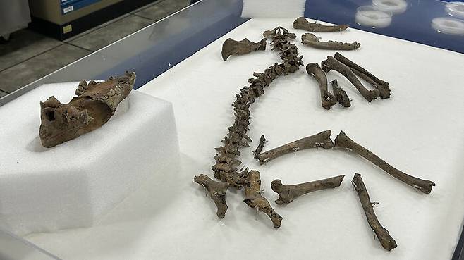 ▲ 지난 11일 경북 경주시 신라월성연구센터 숭문대에서 공개된 월성 남성벽 출토 개 뼈 모습