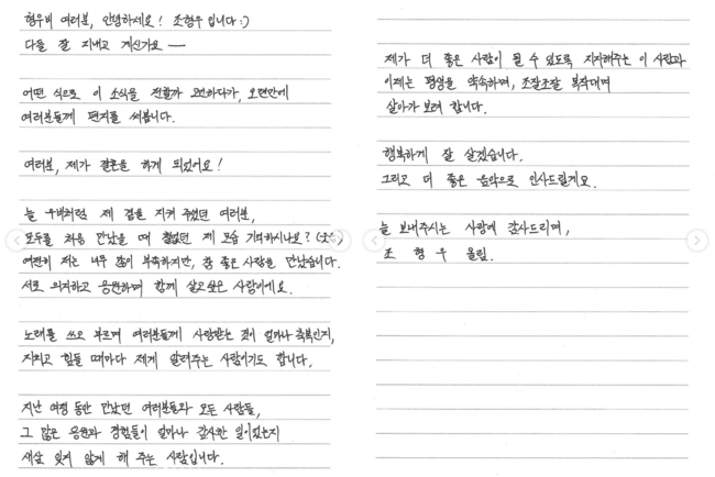 또한 조형우는 “제가 더 좋은 사람이 될 수 있도록 지지해주는 이 사람과 이제는 평생을 약속하며, 조잘조잘 복작대며 살아가 보려 합니다. 행복하게 잘 살겠습니다. 그리고 더 좋은 음악으로 인사드릴게요”라며 “늘 보내주시는 사랑에 감사드리며, 조형우 올림”이라고 편지를 마무리했다.