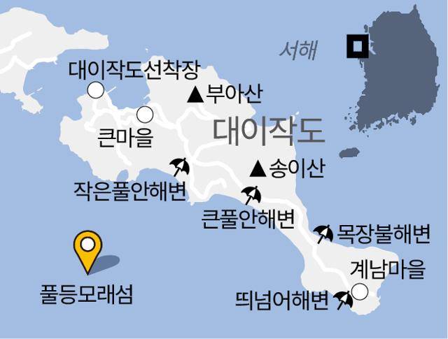 대이작도는 해수욕장도 자랑거리다. 모래가 곱고 파도가 잔잔하다. 면적 2.57㎢, 해안선 둘레 11.8㎞의 작은 섬에 모래사장만 네 곳이다. 섬의 서남쪽에 작은풀안 해수욕장, 큰풀안 해수욕장, 띄넘어(계남) 해수욕장이 있고 동북쪽에 목장불 해수욕장이 있다. 이 중 풀등을 바라보는 작은풀안·큰풀안 해수욕장이 모래가 특히 부드럽고 경사가 완만해 해수욕하기 좋다. 섬 중앙의 장골마을이 인접해 접근성도 좋다.