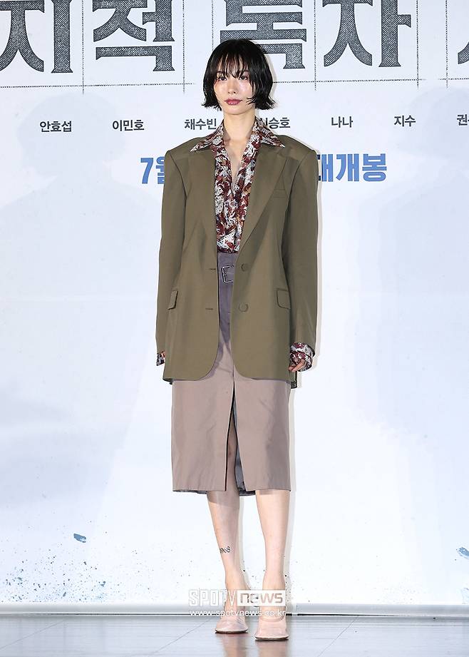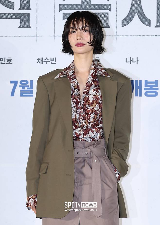 나나는 빈티지한 패턴의 셔츠에 카키톤 오버사이즈 재킷를 매치해 중성적이면서 클래식한 무드를 보여줬다. 그리고 앞트임 디테일이 있는 롱기장의 스커트로 세련된 느낌을 더했다.