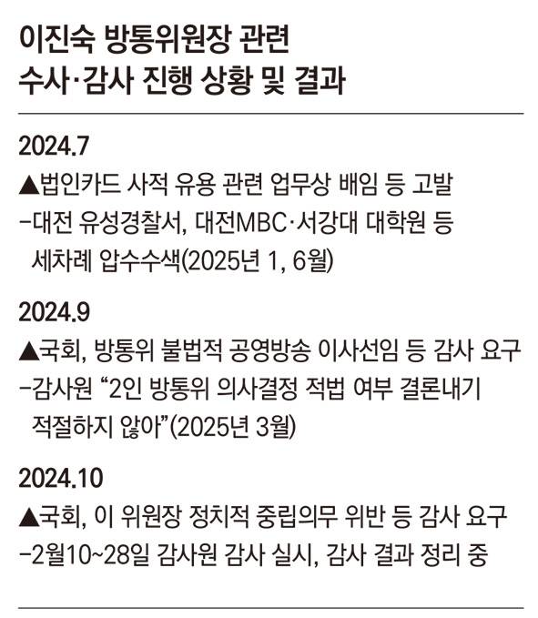 사실상 자진사퇴 의사가 없음을 밝힌 이 위원장에겐 불리한 형국이 이어지고 있다. 지난해 7월 인사청문회 과정에서 제기된 대전MBC 사장 시절 법인카드 사적 유용 의혹에 대해 대전 유성경찰서는 지난 1월에 이어 6월 초 세 번째 압수수색을 실시했다. 이 위원장에 대한 경찰 소환 조사가 이뤄질 가능성도 거론된다. 이 위원장이 “공무원으로서의 정치적 중립의무를 위반”했다며 지난해 11월 민주당 주도로 통과된 감사요구안에 대한 감사원 결과도 남아있다. 또 김태규 부위원장의 사의 표명으로 현재 방통위는 사실상 ‘1인 체제’가 되어 심의·의결을 할 수 없는 상황이기도 하다.