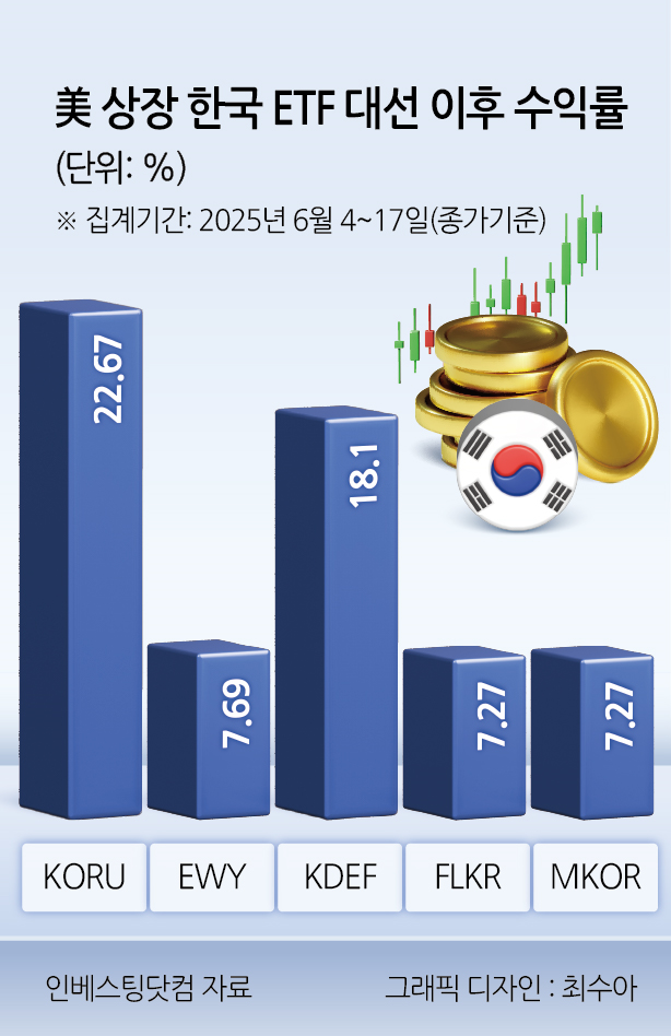 수익률만 봐도 대선 이후 미국에 상장한 한국 지수 및 기업 추종 ETF는 큰 성과를 거뒀다.