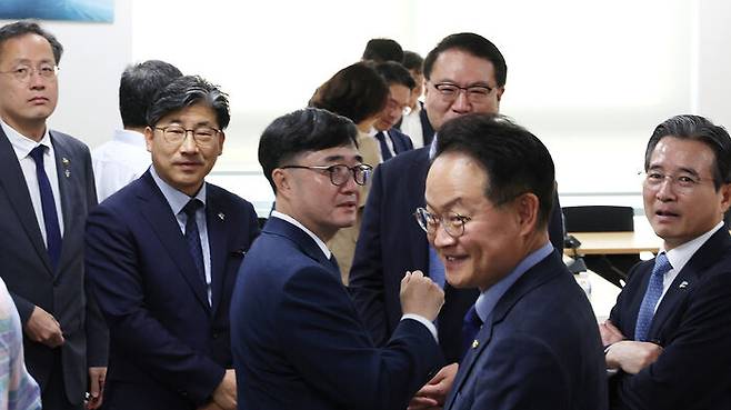 ▲ 대통령실 김용범 정책실장(오른쪽)과 더불어민주당 허영 원내정책수석부대표 등이 18일 서울 여의도 국회 의원회관에서 대통령실과 정부, 여당 등이 함께하는 추경안 관련 비공개 회의에 참석해 대화하고 있다.