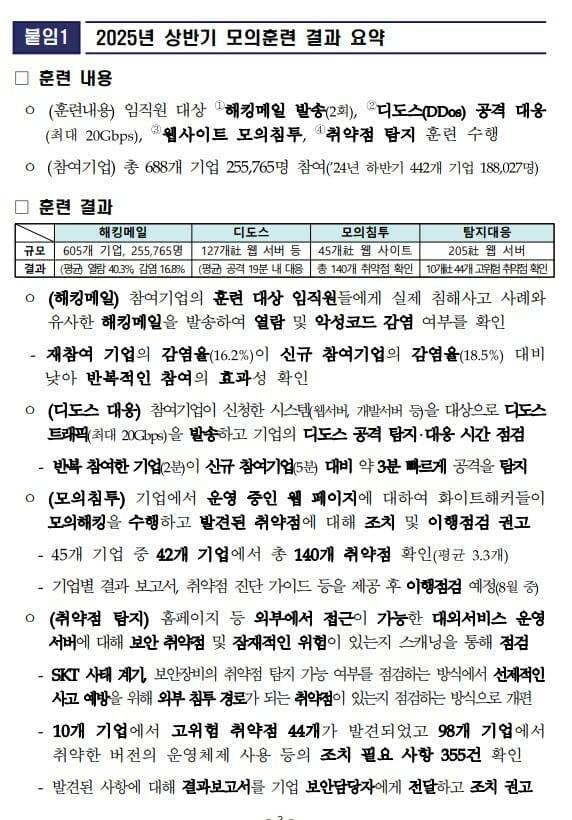 훈련 결과, 총 205개 기업 중 10개 기업에서 긴급하게 조치할 필요가 있는 취약점 44개, 98개 기업에서 위험도가 높진 않으나 취약한 버전의 웹 서비스 등을 사용하는 조치 필요 사항 355개를 확인, 조치 방안을 안내하고 향후 조치 이행 상황을 점검할 예정이다.