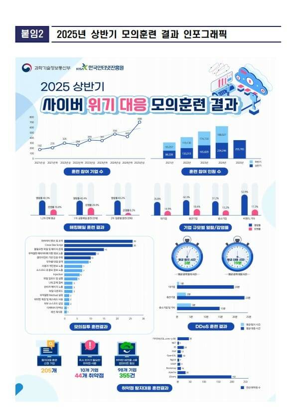 과학기술정보통신부(과기정통부)는 한국인터넷진흥원(원장 이상중)과 함께 '2025년 상반기 사이버 위기 대응 모의훈련'을 5월 중순부터 2주간 실시하고 18일 오전 10시 역삼동 포스코타워 이벤트홀에서 강평회를 개최, 훈련 결과와 우수 훈련 기업 사례를 공유했다.