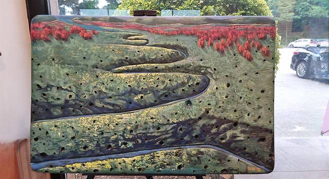 | ▲ 장경희 작가 ‘썰물’ (나무판+아크릴컬러+유화물감, 62×93cm, 2024) |