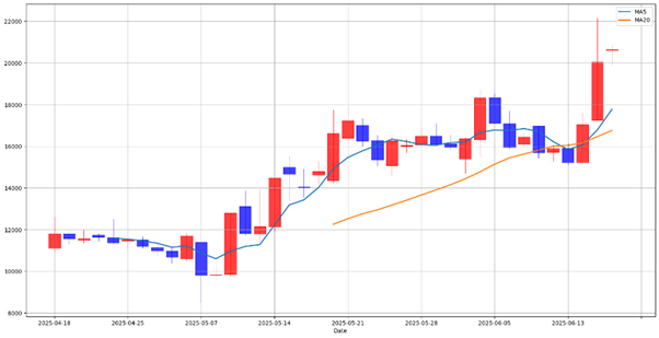 6월 17일 5일 이평선이 20일 이평선을 돌파하는 골든크로스 발생, 발생 후 전일 대비 종가 기준 17.60% 상승하며 20,050원에 마감하였음. 현재가는 20,850원(오전 9시 10분 기준)으로 전일 종가 대비 3.99% 상승한 상태를 보임