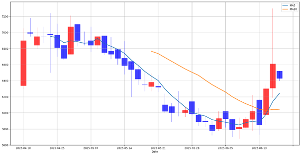 6월 17일 5일 이평선이 20일 이평선을 돌파하는 골든크로스 발생, 발생 후 전일 대비 종가 기준 4.92% 상승하며 6,610원에 마감하였음. 현재가는 6,450원(오전 9시 10분 기준)으로 전일 종가 대비 -2.42% 하락한 상태를 보임