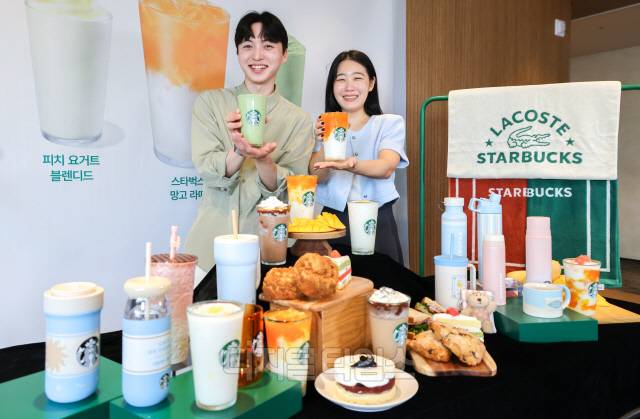 18일 서울 용산구 스타벅스 서울역 아카데미에서 모델들이 여름 신메뉴를 선보이고 있다. 스타벅스는 여름을 맞아 망고를 활용한 라떼 음료를 포함해 요거트·말차·초콜릿 등을 활용한 프라푸치노, 블렌디드까지 총 4종을 새롭게 선보인다.