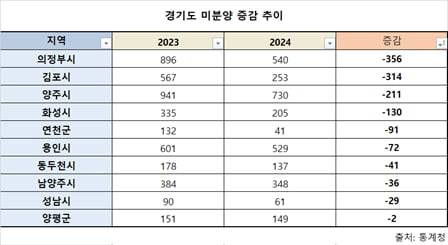 18일 부동산R114에 따르면 지난해 경기에서 미분양을 가장 많이 줄인 지역은 의정부로 나타났다. 2023년 말 미분양이 896가구에 달하던 의정부는 작년 말 540가구로 1년 새 356가구를 줄였다.