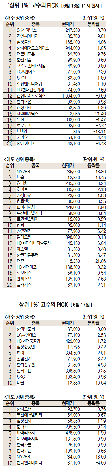 이날 미래에셋증권에 따르면 미래에셋증권 주식 거래 고객 중 최근 1개월간 투자수익률 상위 1%에 해당하는 ‘주식 초고수’들이 오전 11시까지 가장 많이 사들인 종목은 SK하이닉스다.