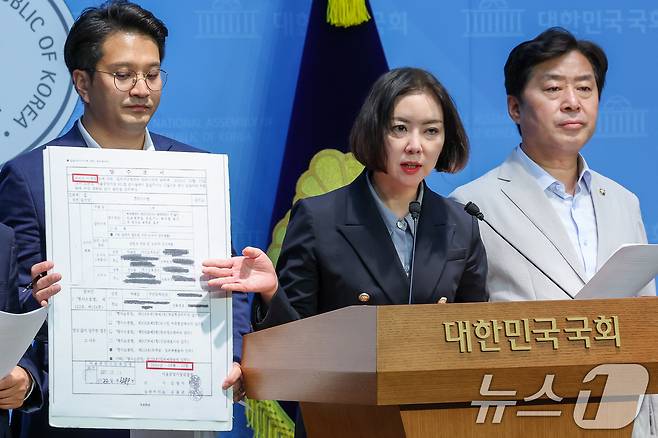 (서울=뉴스1) 안은나 기자 = 임세은 민생경제연구소장이 18일 서울 여의도 국회 소통관에서 열린 '대장동 사건 관련 정치검찰 규탄 및 처벌 촉구 기자회견'에서 검찰의 김용 전 민주연구원 부원장에 대한 압수조서에 이재명 대통령을 수사 대상이 아닌 피의자로 표기한 것을 가리키며 발언하고 있다. 2025.6.18/뉴스1