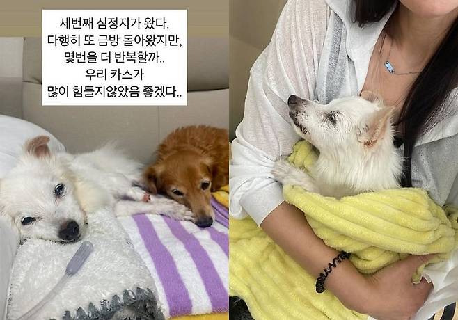 18일 김하영은 개인 채널에 “세 번째 심정지가 왔다. 다행히 또 금방 돌아왔지만, 몇 번을 더 반복할까.. 우리 카스(반려견)가 많이 힘들지 않았으면 좋겠다”라며 한 장의 사진을 올렸다.