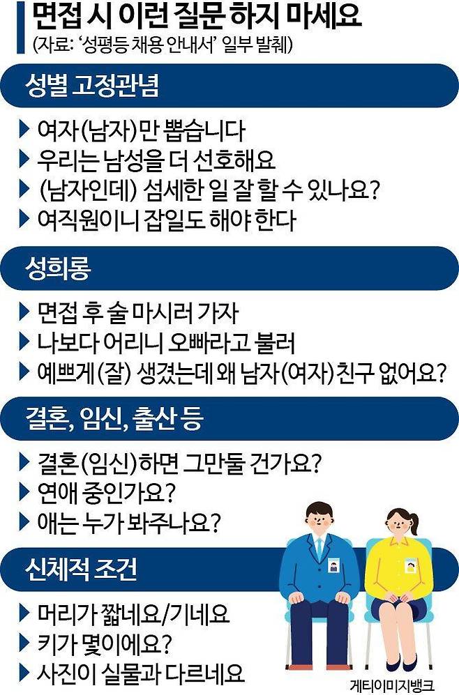 그럼에도 여전히 채용 현장에서 성차별이 존재한다는 인식은 뿌리 깊다. 민주노동연구원이 올해 3월 발간한 '고용상 성차별 경험과 성별 임금 격차 인식' 보고서에 따르면, 전국 임금 노동자 1095명 중 45.9%가 채용 시 성차별이 심각하다고 응답했다. 특히 '채용 시 가족 사항이나 개인적 문제 등 일과 상관없는 질문을 받은 적이 있다'는 질문에 여성 41.3%, 남성 25.1%가 '그렇다'라고 답했다. 여성 24.4%는 특정 성별에 유리한 채용 조건으로 인해 불이익을 경험한 적이 있다고 응답했다. 보고서는 "여성이 결혼, 출산, 육아 등에 대한 질문을 받았을 가능성이 더 크다는 점을 시사한다"며 "이는 직장 내 성별 격차가 채용 단계부터 시작됨을 의미한다"고 분석했다.