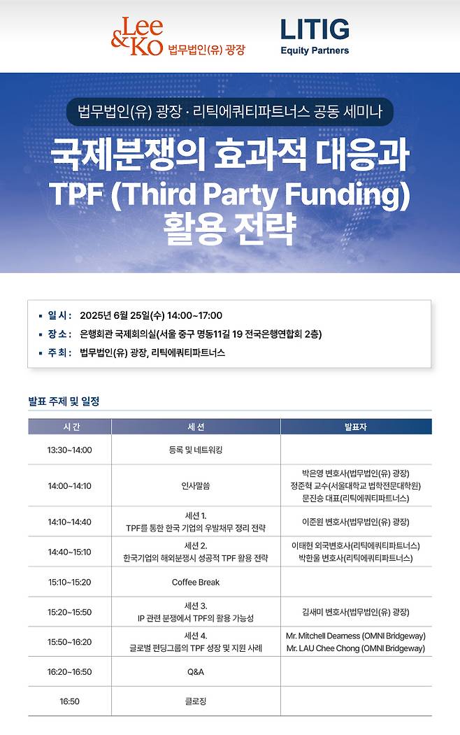 법무법인 광장이 오는 6월 25일 ‘국제분쟁의 효과적 대응과 TPF(Third Party Funding) 활용 전략’을 주제로 오프라인 세미나를 개최한다. 이번 세미나는 기업들이 국제분쟁 리스크에 효과적으로 대응하고, 비용 부담 완화 수단으로 떠오른 TPF 활용 전략을 공유하기 위해 마련됐다.