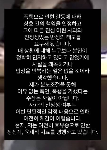 은종은 이 영상이 윤딴딴이 자신을 폭행하는 영상이라며 "제가 분노조절을 못해 이유 없는 폭언, 폭행을 가했다는 주장은 사실이 아니다. 현재 저는 여전히 후유증으로 인한 정신적 육체적 치료를 병행하고 있다"고 주장했다.