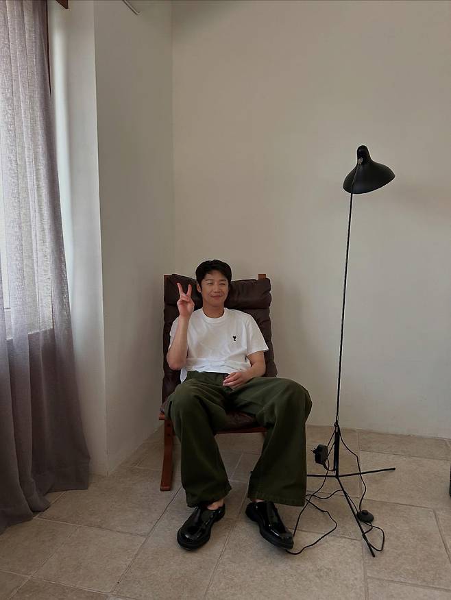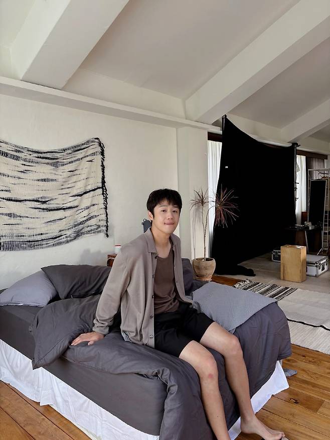 또 다른 사진에서는 흰 티셔츠에 카키 팬츠를 매치한 채 의자에 앉아 손가락 브이 포즈를 취하며 촬영장의 편안한 분위기를 전했다. 군더더기 없는 스타일링과 수수한 표정에서 우러나는 매력이 정준원 특유의 무해한 분위기를 강조했다.