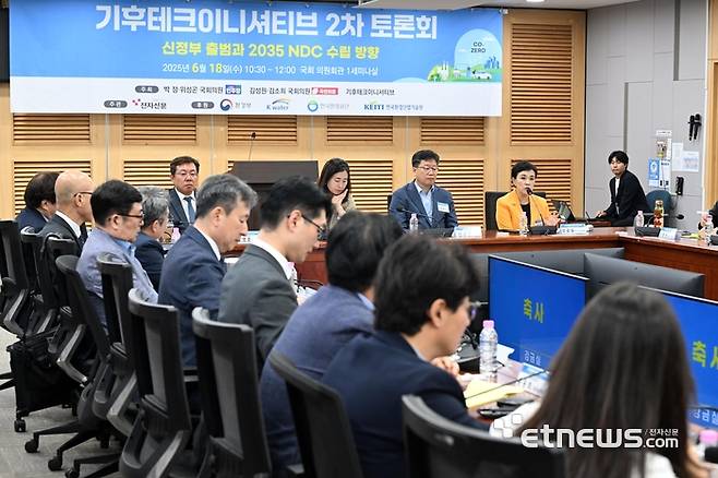 기후테크이니셔티브 2차 토론회가 '신정부 출범과 2035 NDC 수립 방향'을 주제로 18일 서울 여의도 국회 의원회관에서 열렸다. 강금실 경기도기후변화대사가 축사를 하고 있다.