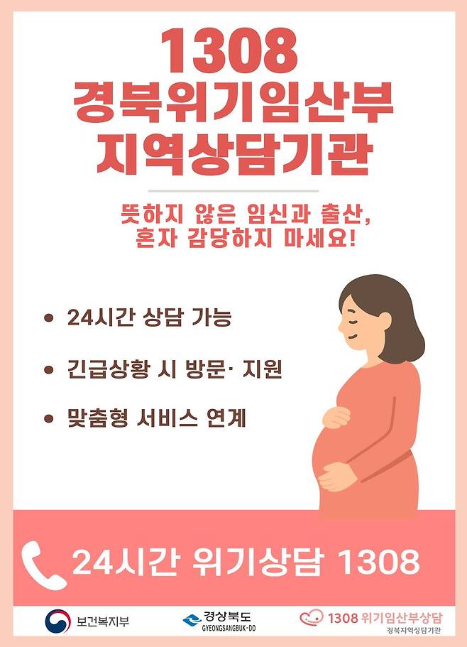 경북도는 구미시에 있는 ‘경북서부아동보호전문기관’을 위기임산부 지역 상담 기관으로 지정해 24시간 상담체계(전화 1308)를 구축하고 있다. 임신‧출산 과정에서 어려움을 겪는 여성들에게 심리상담 및 진료비와 출산비 지원, 산후조리 연계 등 맞춤형 서비스를 제공한다.