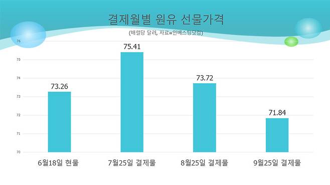 같은 시각 뉴욕상품거래소에서 거래중인 미국 서부텍사스산원유(WTI) 선물가격을 보면, 7월물은 배럴당 75.41달러인데, 8월물은 73.72달러로 오히려 1.69달러 싸다. 9월물은 71.84달러로 더 싸다. 9월물은 같은 시각 배럴당 73.26달러인 원유 현물 가격보다도 낮다.