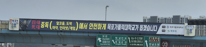 현수막에 적힌 슬로건은 '四대 중독, 死대 중독'이다. 목포가톨릭대학교가 주최하고, 목포시가 후원해 제작된 현수막은 "4대 중독에서 안전하게 목포가톨릭대학교가 돕겠습니다"라고 적혀 있다. 이는 알코올, 도박, 마약, 인터넷/게임 등 4개 중독 유형이 죽음을 부를 수 있다는 뜻으로 풀이된다.