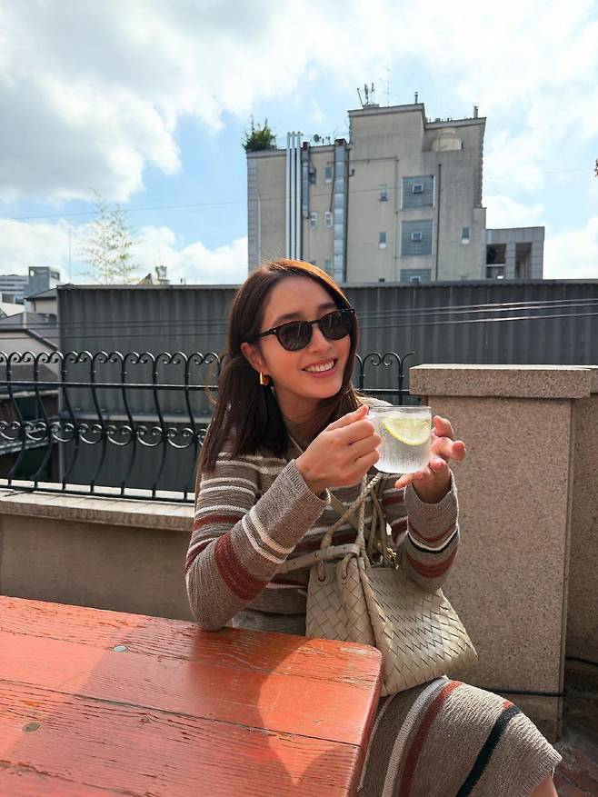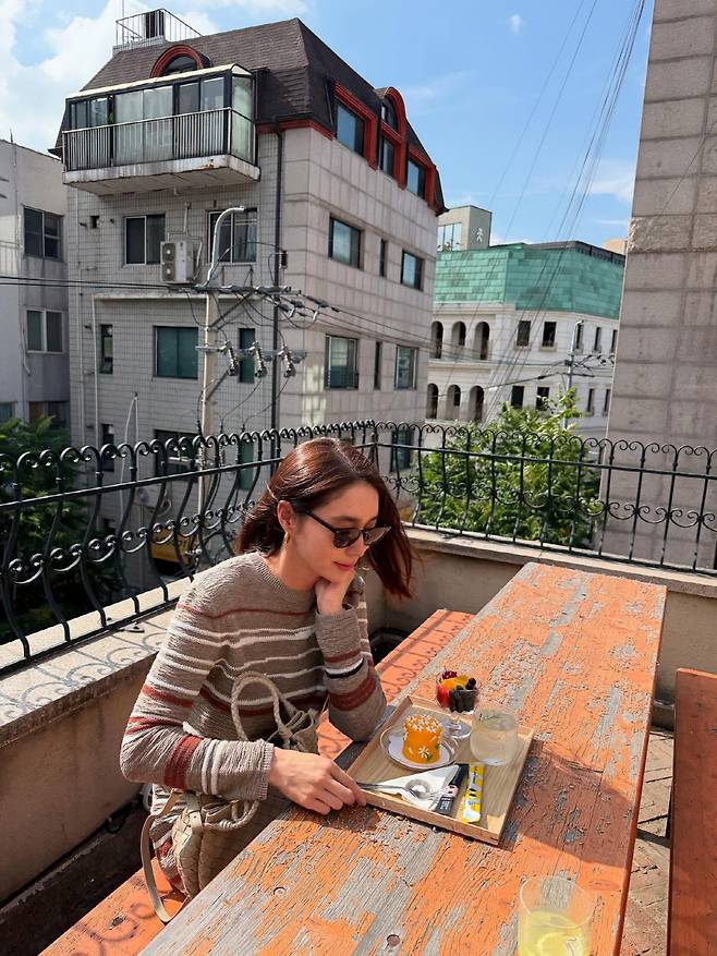 사진에서 이민정은 브라운 계열의 스트라이프 니트 원피스 차림으로 테라스 카페에 앉아 레몬이 띄워진 음료와 디저트를 즐기고 있다.