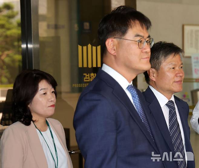 [서울=뉴시스] 홍효식 기자 = 윤석열 전 대통령 부인 김건희 여사 관련 의혹을 수사하는 오정희(왼쪽부터), 김형근, 문홍주 특검보가 18일 서울 서초구 서울중앙지방검찰청에서 박승환 검사장 직무대리와 면담을 마친 뒤 민중기 특검보의 취재진 질의응답을 기다리고 있다. 2025.06.18. yesphoto@newsis.com