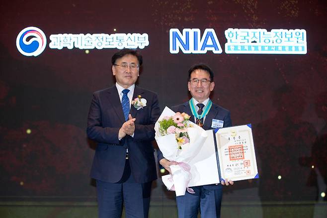 [서울=뉴시스] 유상임 과학기술정보통신부 장관이 18일 오후 서울 마포구 중소기업DMC타워에서 열린 '제38회 정보문화의 달 기념식' 에서 원종철 한국철도공사 디지털융합본부장(정보문화 유공 훈장, 동탑 산업훈장)과 기념촬영을 하고 있다..(사진=과학기술정보통신부 제공) 2025.06.18. photo@newsis.com *재판매 및 DB 금지